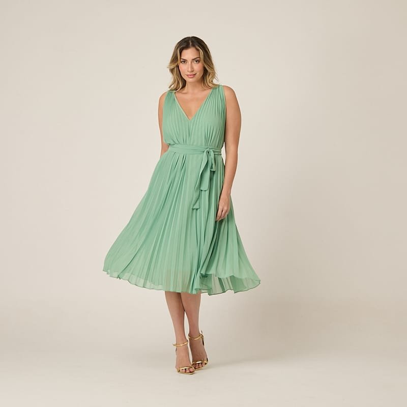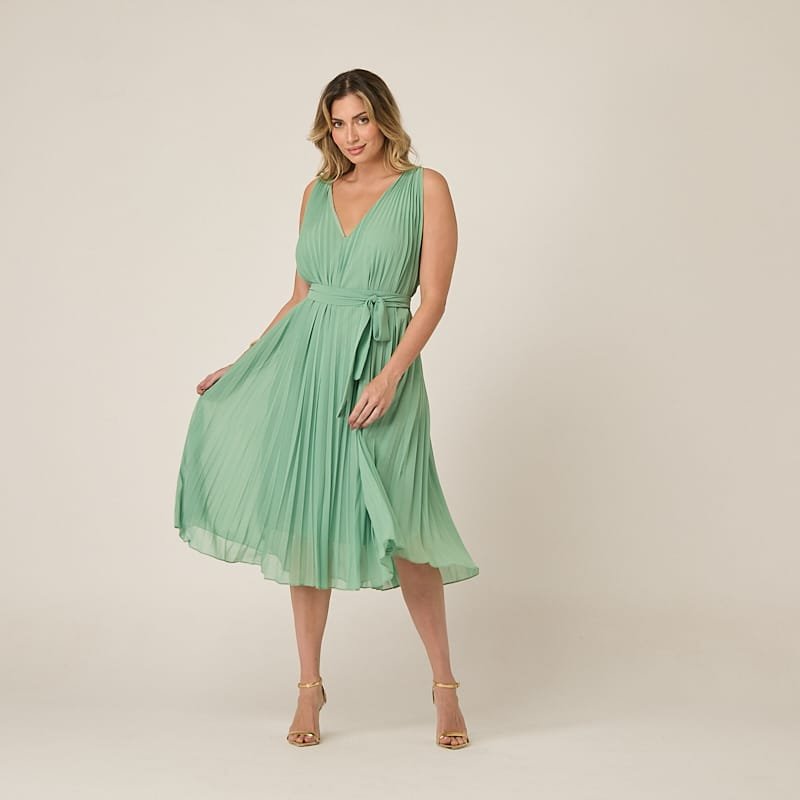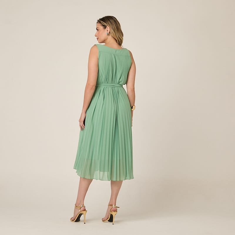 Feito com tecido leve e plissado, este vestido combina elegância e conforto. Use-o com saltos e acessórios sofisticados para um look formal, ou adicione uma jaqueta jeans e tênis para um visual mais descontraído e moderno.