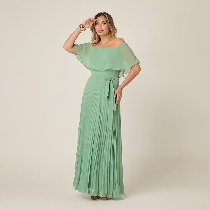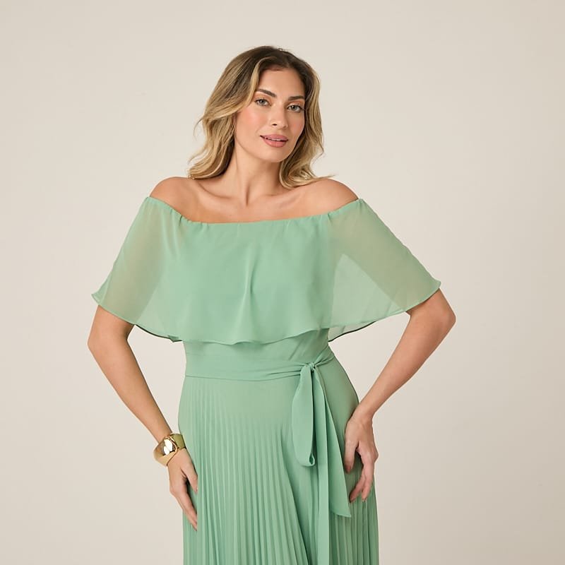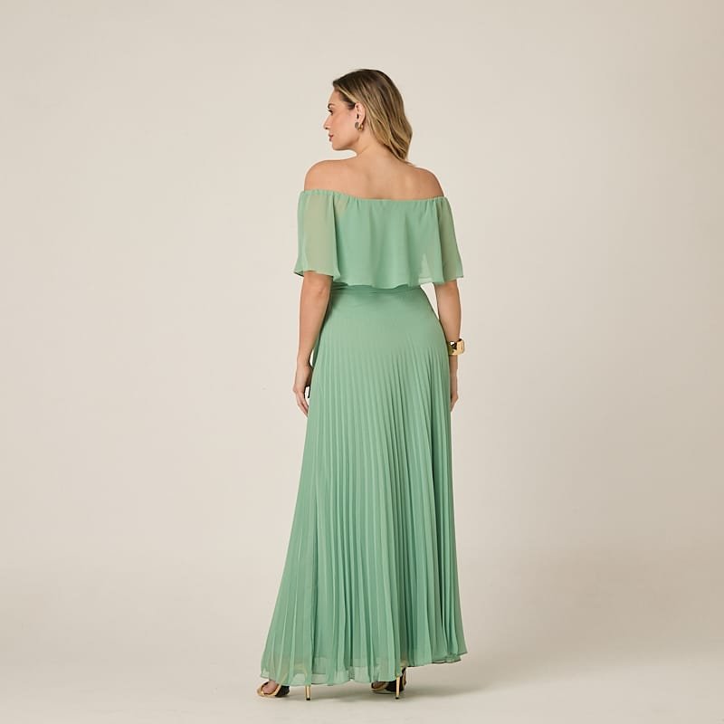 Escolha elegante para eventos que pedem um toque de glamour. O design tomara que caia valoriza os ombros, enquanto o plissado cria movimento e textura, proporcionando um caimento fluido e leve.